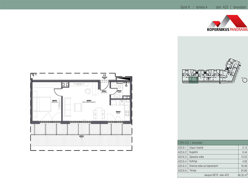 2,0 stan od 66,35m2 u A lameli na povučenom spratu.