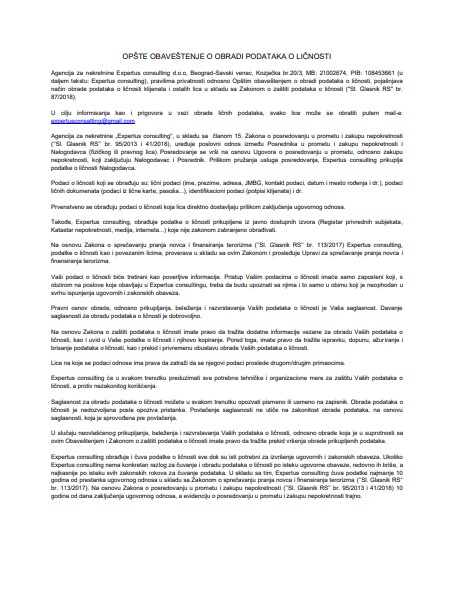 Opštim uslovima poslovanja Agencije za nekretnine „Expertus consulting“, u skladu sa članom 28. Zakona o posredovanju u prometu i zakupu nepokretnosti, uređuje se poslovni odnos između Posrednika u prometu i zakupu nepokretnosti i Nalogodavca (fizičkog ili pravnog lica). Zaključenjem Ugovora o posredovanju, Nalogodavac potvrđuje da prihvata, odnosno da je upoznat i saglasan sa odredbama Opštih uslova poslovanja posrednika u prometu nepokretnosti.