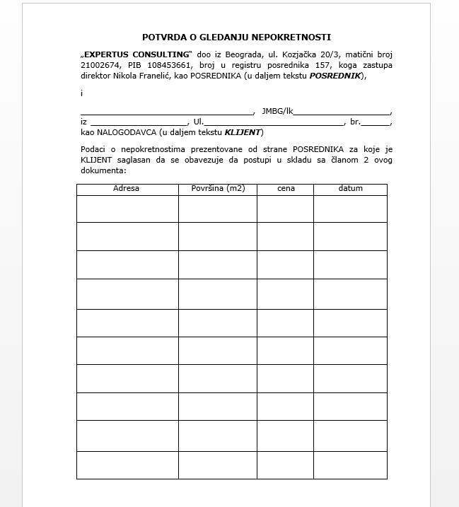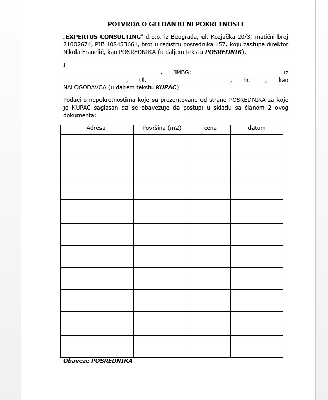 Kupac/zakupac u svojstvu Nalogodavca je obavezan da neposredno pre razgledanja nepokretnosti potpiše posredniku Potvrdu o gledanju nepokretnosti, u kojoj potvrđuje da je predmetnu nepokretnost prvi put gledao posredstvom Posrednika.