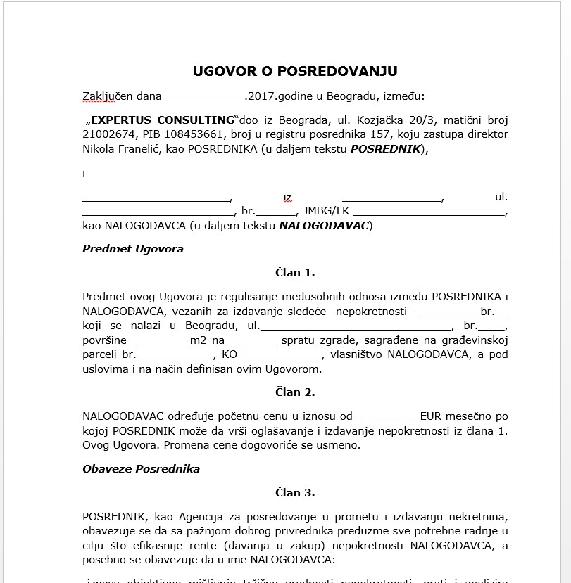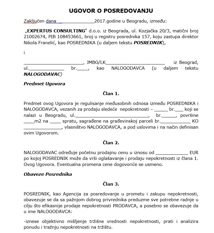 Posredovanje se vrši na osnovu Ugovora o posredovanju u prometu, odnosno zakupu nepokretnosti, koji zaključuju Nalogodavac i Posrednik.